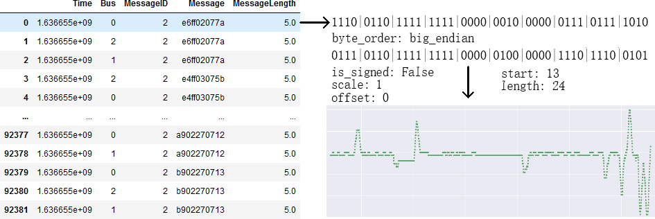 A raw signal value can be obtained by interpreting the original CAN message with the signal boundaries, endian- ness, and signedness from this decoding process. Figure 3 shows an example of this decoding workflow.