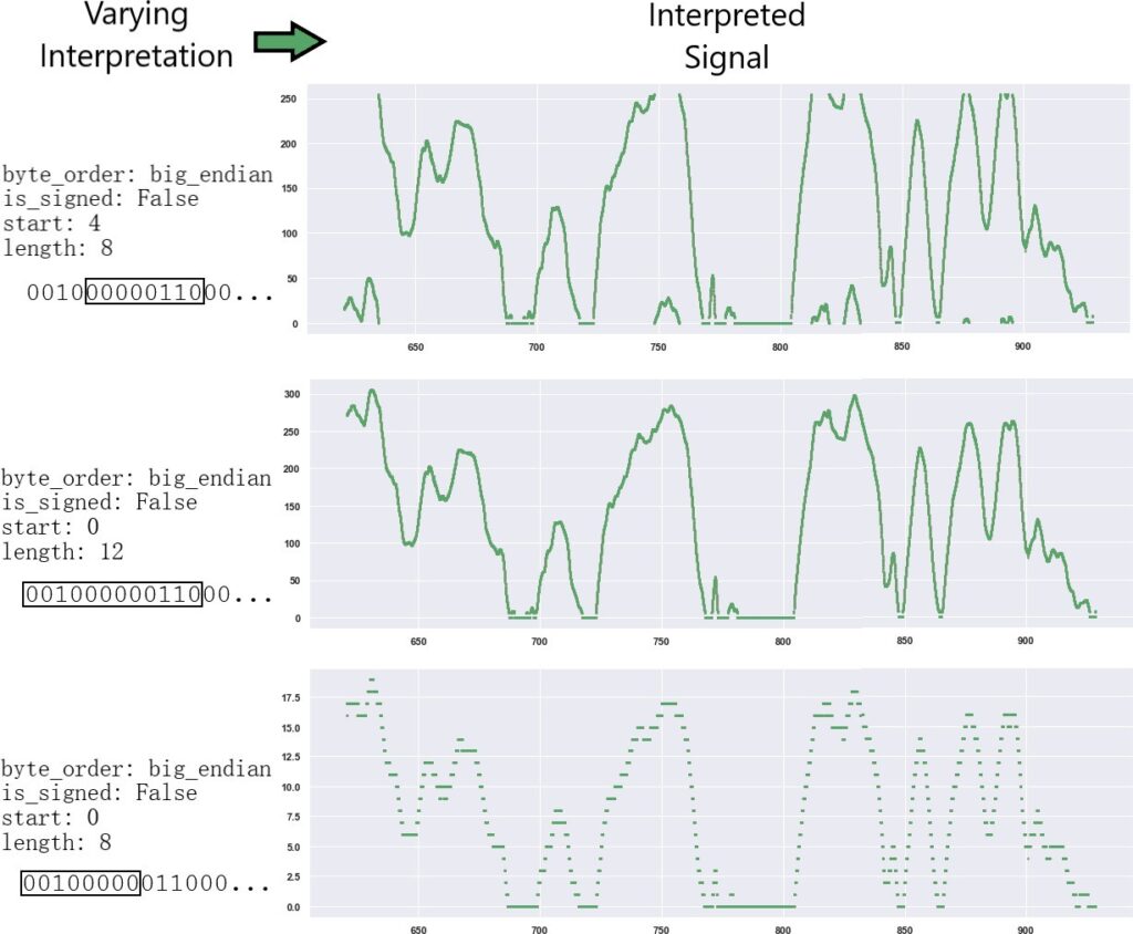 Algorithm 2, interpretive convolutions, were then used to generate a signal of the correct input size for the CAN classification network. This algorithm is similar to what Convolutional Neural Networks [17] do for images, but instead are interpretive convolutions for CAN messages. Differing sizes of bit widths are used to interpret the same message across all possible positions in the message. This generates a vector of varying bit boundaries, byte orders, and sign values used to interpret the message. Interpreting CAN signals with bit widths similar to the true bit width of a signal will generate time series signals which have similar behavior to the true signal, allowing the LSTM to learn from signal behaviors relevant to each type of signal. This behavior similarity is visually demonstrated in Figure 2.