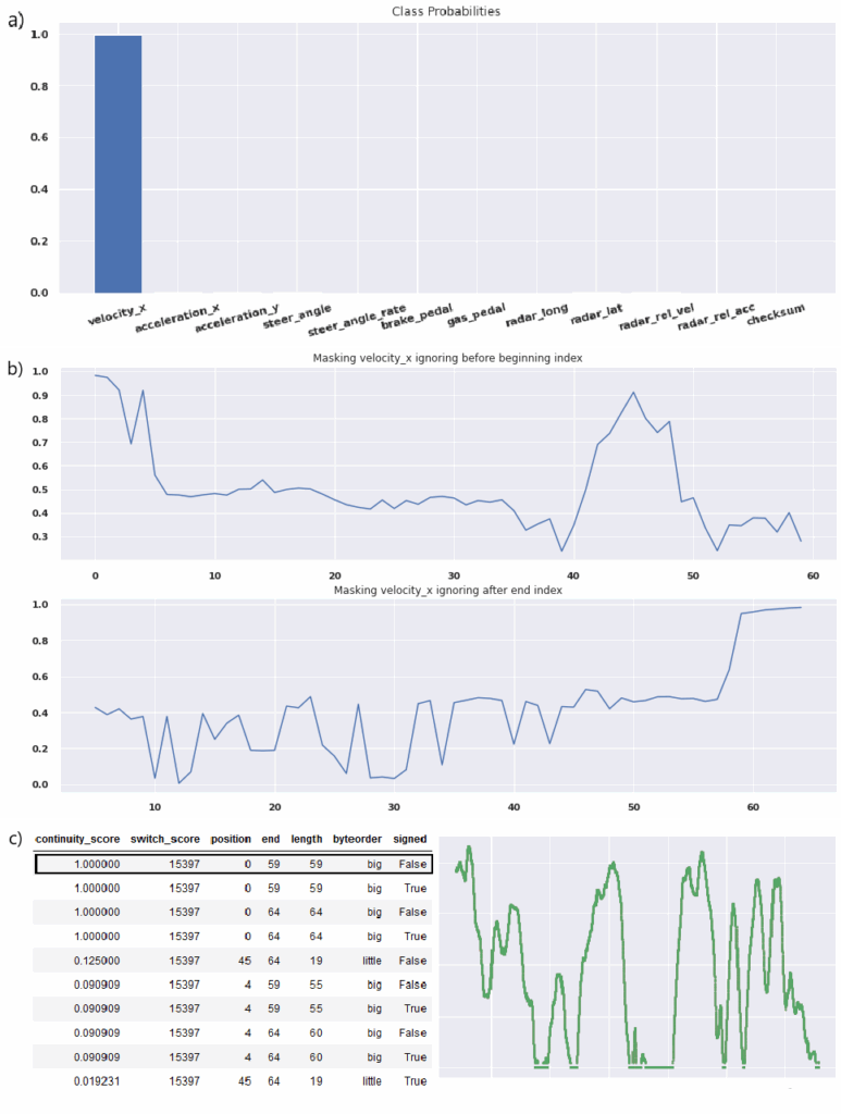 The bit boundaries of the signal can then be found using Algorithm ??, which iteratively masks the signal to evaluate which part of the message contributes to the prediction of the class of interest. This algorithm generates scores for each possible starting and ending bits of a signal. The left bit boundary is encoded as a peak in the starting scores, and the right bit boundary is encoded as a peak in the ending scores. Each boundary combination, endianness, and signedness are interpreted for each signal. Finally, these interpretations are filtered based on three criteria. First, the interpretations scored based on continuity. Continuity is approximated by counting the number of differences in value between two timesteps which are within 10% of the range of a signal, as shown in Equation 1. Only signals which have a continuity score of greater than 50% are accepted. Signals are then scored based on the rate at which they vary, which is the number of times the value changes — the highest score is accepted as the encoding. Finally, counter signals are filtered out [13]. The ultimate output from this filtering process is an endianness, signedness, and signal type label for each detected signal.