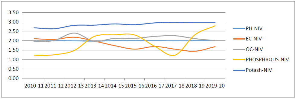 For selected village all farmers data used for calculation of village soil property status for ten years from 2010-2020.Yearly nutrient index is calculated combining all twenty village samples for that year, which is indicated in Table 7. Samples are classified as per Table 6. Figure 4 shows NIV trends over ten years. Table 6 gives overall soil nutrient status of study area.