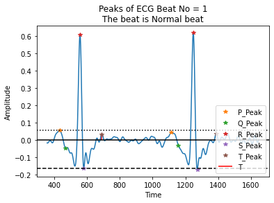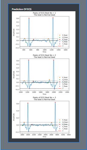 The process of peak detection was used to extract features. The Hamilton segment and window method were used to detect peaks. The signal is then divided using the R-peak value. Because we needed at least two ECG beats to compute separate intervals, we chose two peaks for a single segment. The remaining ECG peaks are then determined or found using the window technique. The window index falls between -90 and -10 of the R-peak value, with P standing for the highest value. Q is the lowest value in the -40 to -10 range, and T is the highest in the +25-to-+90-degree range. The wavelet component trains the model and QRS complexes. Discrete Wavelet Transform (DWT) has proven to be a valuable technique for detecting peaks. The DWT employs scale and position values based on two powers, which is the most evident distinction. Signal decomposition and reconstruction are the main concerns in DWT and inverse DWT, respectively. Low-pass and high-pass filtering with down sampling and up sampling are the essential concepts of decomposition and reconstruction. We obtained PR and RR intervals by detecting the rest of the peak.