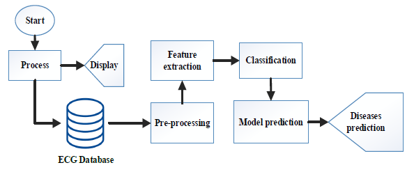 The principal flow diagrams of this research have shown in Figure 2. This work implemented a hardware and software module to create an interface between the patient and the device for collecting the ECG data from the patient. A computer, a Raspberry Pi, a HealthyPi v3 equipped with an ECG module, a Spo2 sensor, a temperature sensor, electrodes, and software platforms written in Python and Java have been used to construct the system. Later, to develop GUIs and do signal processing and categorization, Python was employed.