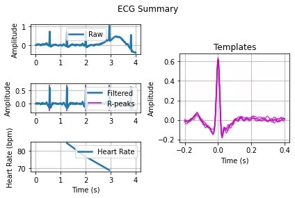 Hamilton Segmenter and the window approach were employed for peak detection, and R peak was effectively discovered. For the training model and QRS complex, we used discrete wavelet components. The heartbeat was retrieved from the signal in this case, Figure 8. The template is shown in a magenta colour. The derived maximum amplitude before and after filtering the signal was 1 mV and 0.6 mV, respectively, as shown in Figures 6 and 7. The amplitude of the signal shown in the template was 0.6 mV. The heart rate was measured by analyzing the characteristics of the obtained ECG signal, and it was found that the heart rate varied within the range of 68-85 bpm for a 4s time span.