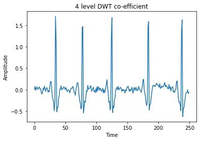 After restricting heartbeat with Hamilton Segmenter, we employed four-level DWT. Figure 9 shows a DWT that divides a signal into many sets, each with a group of coefficients that characterize the signal’s time evolution in the associated frequency band. A discrete wavelet transform decomposes a signal into several sets, each containing a time series of coefficients describing the signal’s time evolution in the corresponding frequency band.