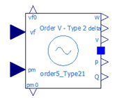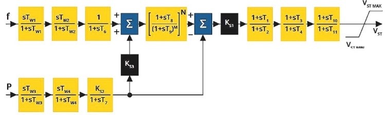 AVR modelling is in Section 2-2 and PSS is in Section 2-3. The closed-loop response has two outputs, P (power) and w (velocity), which are connected to the corresponding inputs of the PSS. A frequency f block was added that allows to change the speed to frequency and therefore being able to meet the number of equations and unknowns for the Generator validation. Enhancements have also been made to the PSS output to address what-if scenarios. The internal block diagram is shown in Figure 2 and the external block diagram is shown in Figure 3.