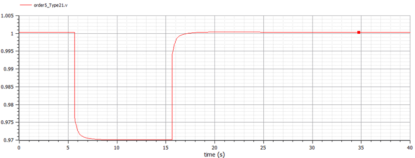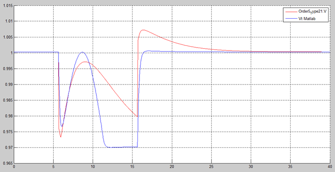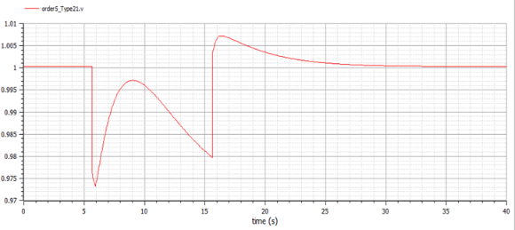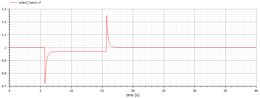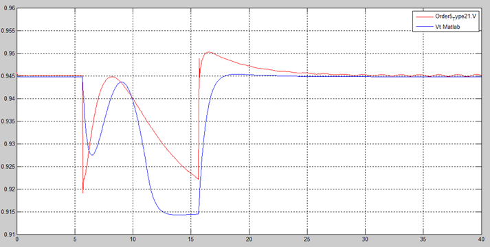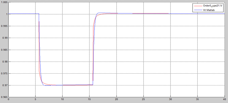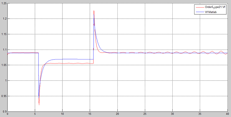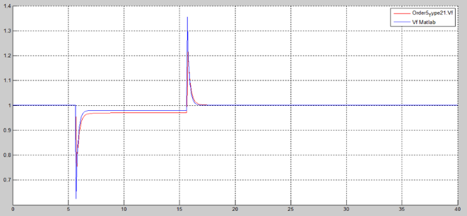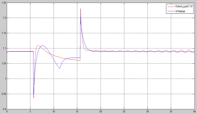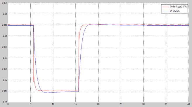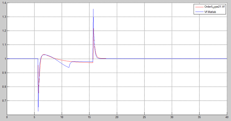 By changing ‘gain2’ from zero to one, Figure 19 shows the isolated AVR + PSS field voltage response. Figure 19 shows stable response. Figure 20 shows a comparison of the electric field voltage responses of the non-causal (red curve) and causal models (blue curve) of AVR + PSS. These differences are not relevant.