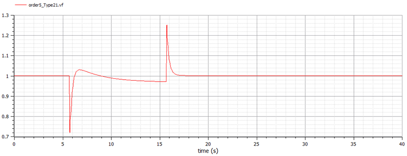 An isolated test of the controller was performed using a 10 second pulse train with amplitude -0.03 starting at 5.65 seconds, so the system returns to normal in 15.65 seconds. The field voltage response under these conditions is shown in Figure 15. In this figure, ‘gain2’ is set to zero to show only-AVR isolated field and terminal voltages responses.