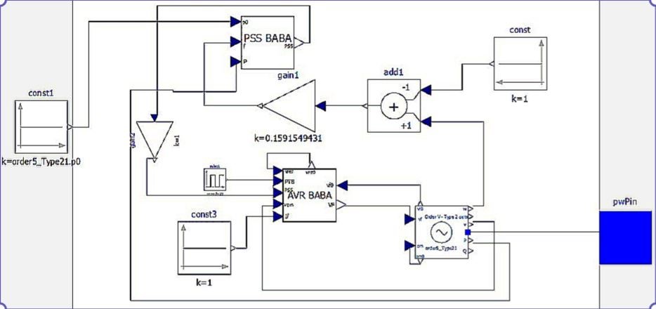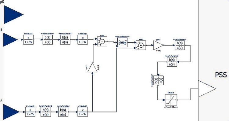 The PSS controller has a large number of ‘simple lag’ and ‘TransferFunction’, constants, limiters, input and output signals. It also has a ‘RampTrackingFilter’ for attenuating the signal. Non-casual modelling is shown in Figure 9.