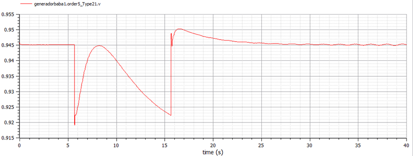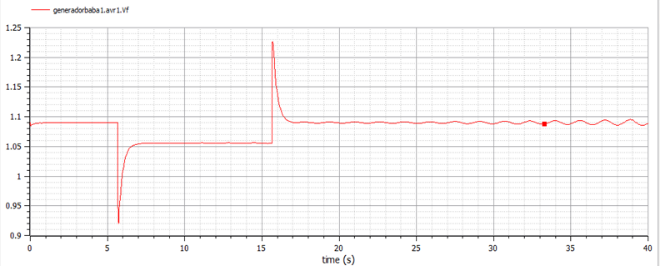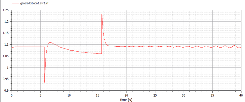 In summary, in the Ecuadorian NTG has many disturbances that affect the power grid and can affect the generator reliability. Some disturbances are from large loads. When a large load is suddenly connected to the power grid, the power demand increases as shown in the diagrams of this Section. When a load is suddenly added, the Baba generator frequency begins to oscillate. In the case of small load, oscillation can be damped quickly. Figures of this Section also show that the PSS helps damp these oscillations by modulating the generator excitation.