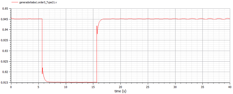 This Section shows the NTG field voltages and terminal voltages using the infinitive bus described in Section 2.7. An equivalent schema is shown in Figure 13. The same disturbances are used as for the isolated test, i.e., start at 5.65 seconds with and amplitude equal to -0.03 using a pulse train of one period. Figure 23 shows the NTG field voltage in the non-causal model using the AVR controller and Figure 24 shows the AVR field voltage comparing the non-causal and causal responses. Figures 23 and 24 show a stable response.