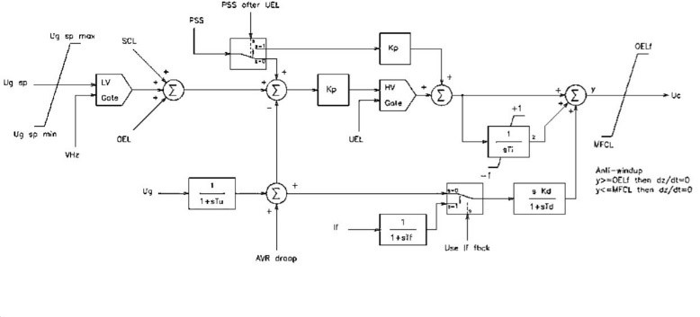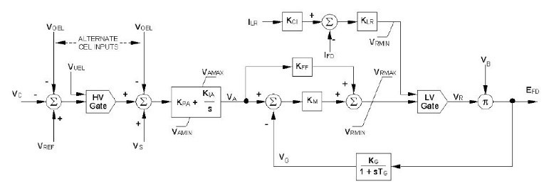 The AVR appeared in Figure 4 comprises of a PI voltage regulator with an internal loop field voltage regulator and pre-control. The field voltage regulator executes a proportional control. The pre-control and the delay in the feedback circuit increase the dynamic response. VR represents the limits of the power rectifier. The ceiling current IFD limitation is included in this model. The power for the rectifier, VB, may be supplied from the generator terminals or from an independent source. Inputs are provided for external models of the over-excitation limiter (VOEL), under-excitation limiter (VUEL), and PSS (VS).