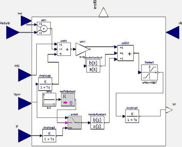 Figure 6 is a simplified non-causal AVR approach to modelling the Baba excitation system. Traditional approaches are based on block-oriented schemes in which causality plays a key role. However, new concepts based on object-oriented approaches, physics-oriented connections, and algebraic manipulation enable non-causal modelling, where blocks represent the interactions of equations.