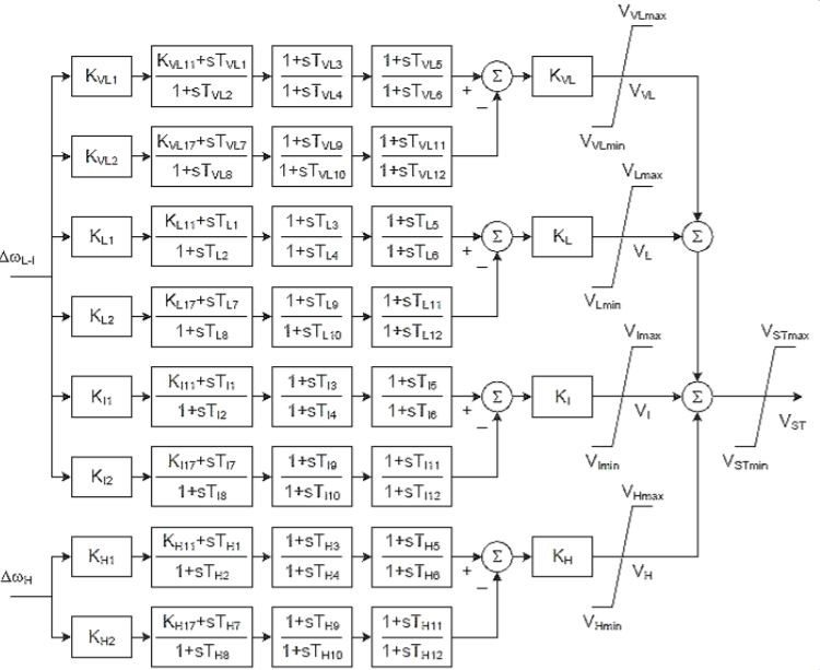 The IEEE 2005 421.5 standard [5] introduced a PSS structure called IEEE PSS4B. The PSS4B model represents a structure based on multiple operating frequency bands, as shown in Figure 7. Three separate bands, each dedicated to the low-, medium- and high-frequency oscillations modes, are used in the delta-omega (velocity input). Baba uses the IEEE Std 421.5TM-2016 Dual-Input Power System Stabilizer (PSS2C) [21] to improve electrical system stability, as shown in Figure 8. A key element is the Limiter. The Limiter is used to keep the PSS output voltage within a range of values and the PSS output protection should also match the output limiter. Additional damping can be achieved to improve transient stability by setting the PSS output limit. As a result, the PSS performance improves under larger system disturbances [22].