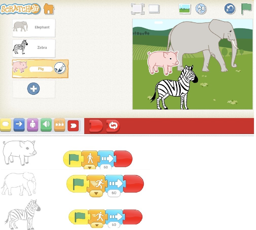 Exercises are aimed at recognizing the groups of blocks and using them creatively. The first one is, in fact, dedicated to the blue group that will lead the babies to organize the school dance. Each child chooses his character and his 10 moves. An example of an implementation performed by 3 children can be seen in Figure 9. Then, exploring the orange block, students can play a game of guessing who comes first among the chosen animals. One child in turn will choose 3 different animals, decide the speed of each one to the other children will decide which animal to bet on. In the example proposed in Figure 10 the child had the heavy elephant come first, the fast zebra second and the lazy piglet third. The level of difficulty is increased in subsequent lessons by proposing the creation of real stories. For example, this school year’s class decided to fulfill the math and science teacher’s dream by arranging for her to travel to the moon.