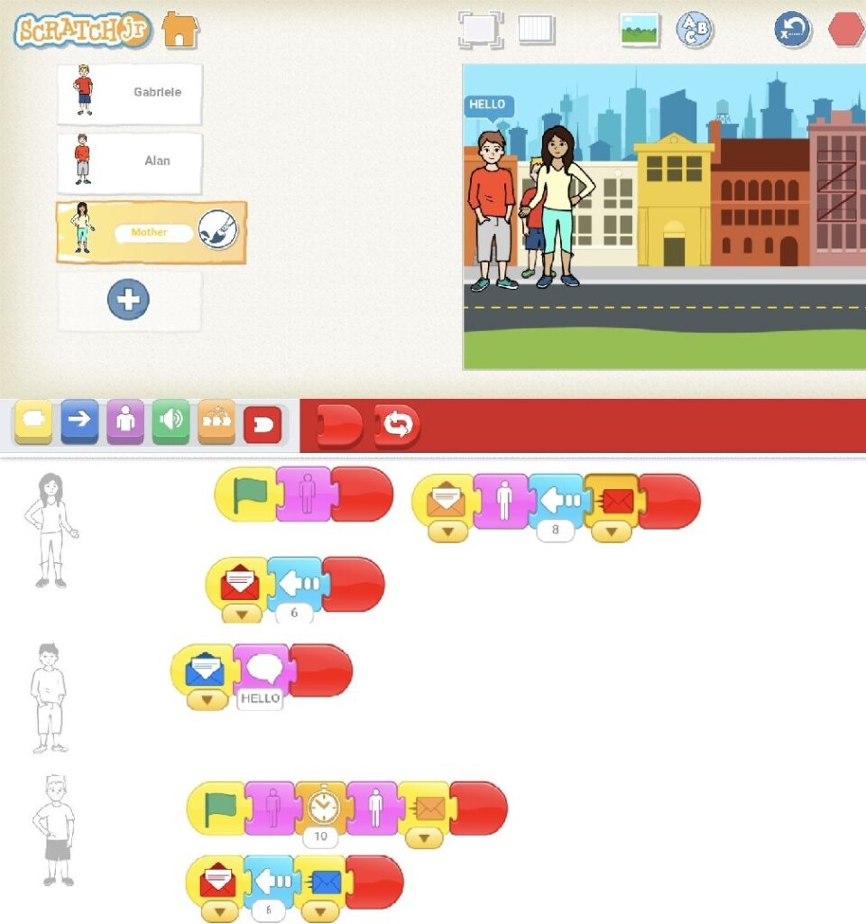 As a last exercise they are stimulated in thinking of a more complex story with at least three characters interacting with each other. For example, one class proposed the follow- ing story: the child comes out of school and his mother takes him to his best friend’s house to play together. Together with the teacher, the children first have to identify inter- actions, that is, when one character’s action starts another character’s sequence. In this case, the following interactions were identified: