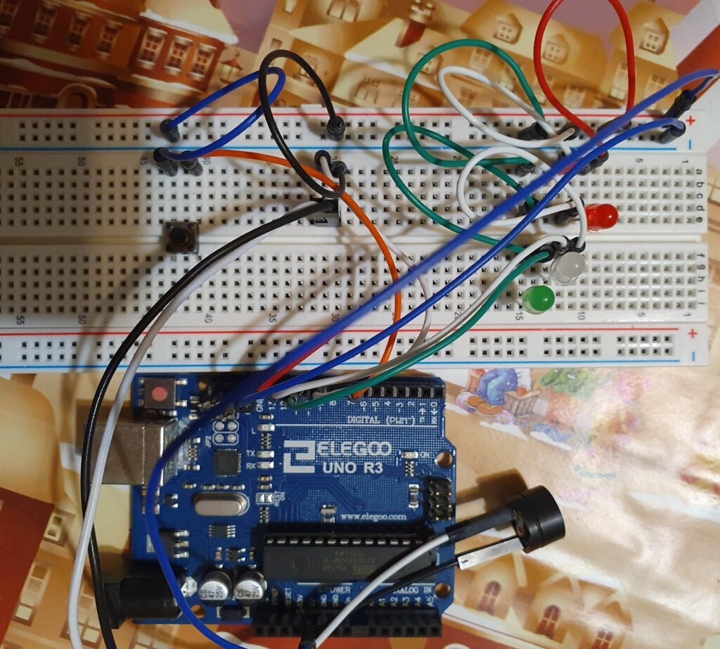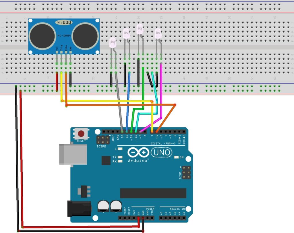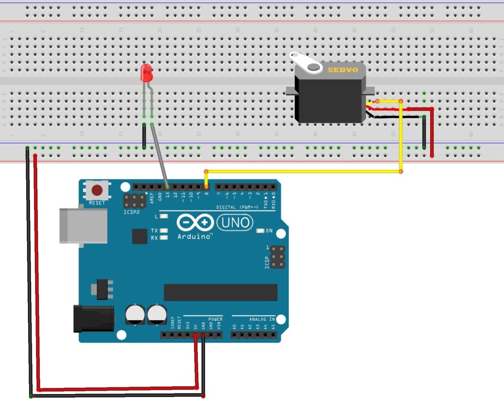 The low-cost kit proposed to the school contains many other devices not used here but which can lead to further projects that can be implemented in a primary school but with a great final functional impact. For example, it could be possible to automatically turn on the external lights of the school that is part of the project, using a proximity sensor. The cardboard model representing the school is equipped with some LEDs connected to a proximity sensor and an ultrasonic sensor is placed on the ground. When you place a hand at a predefined distance or less, all LEDs will light up for a certain number of seconds. The circuit diagram is shown in Figure 21. In Figure 22 we see a last example of a level crossing. In an infinite loop, for example every 5 minutes, the servomotor is activated so that the rod attached to it, colored to remember the level crossing, moves 90 degrees centigrade to close going into a horizontal position, lighting up the red LED parallel to the start of the movement. After 1 minute the servomotor will move 90 degrees in the opposite direction, so as to reopen returning to the vertical position, and finally the LED will turn off.