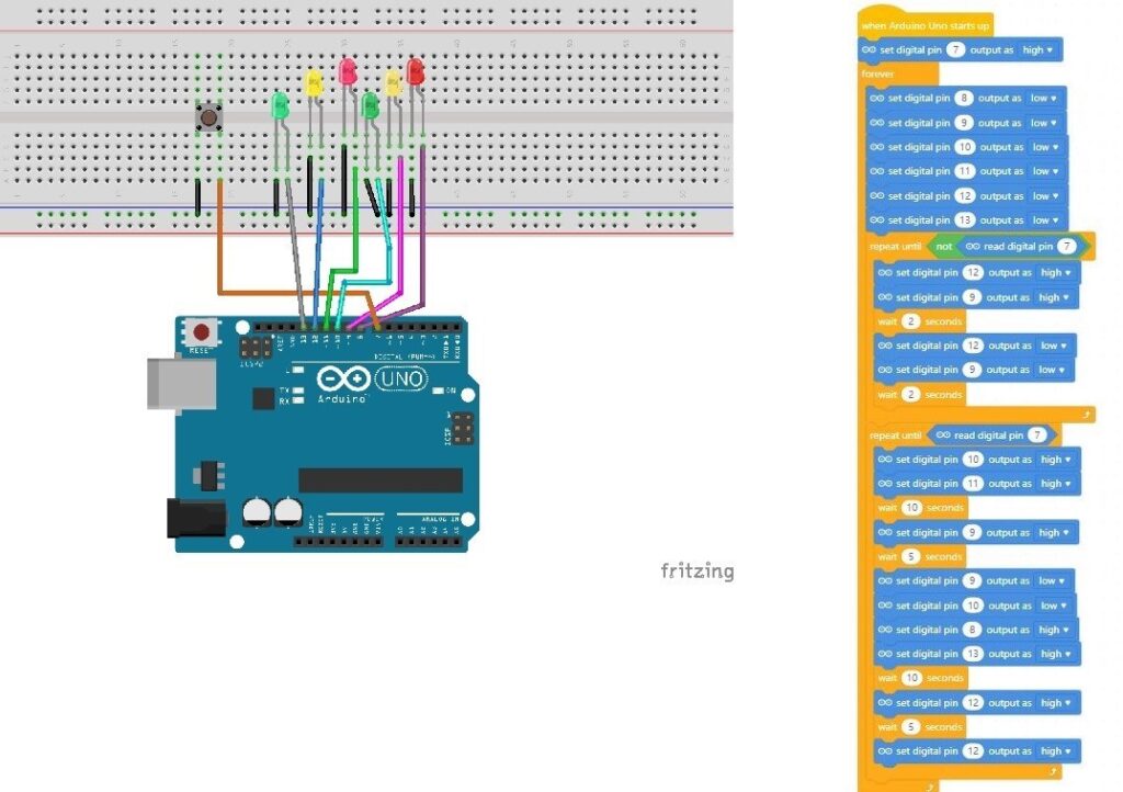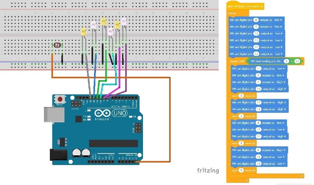 The simplest projects made by groups of two children will be as follows: The starry sky: several white and yellow LEDs with different on and off timings will be placed behind a blue veil, giving the idea of stars shining. A light sensor will be placed upstream so that the led circuit will be activated only if the sensor is in the dark or is dimmed. Design drawing and first draft of programming are respectively on the left and right side in Figure 15