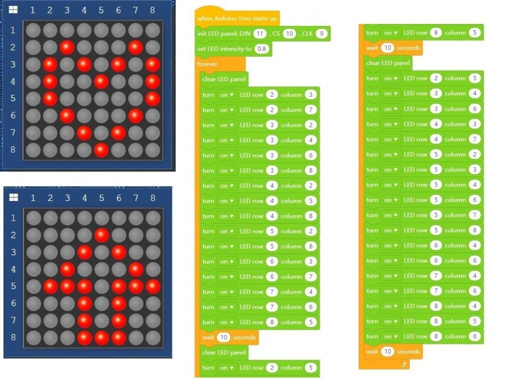 More complicated projects were then chosen to be carried out by larger groups. A group of three children will design an advertising panel in which LEDs are turned on in different ways to show different figures every minute. The main work was to understand the matrix of the LEDs and, by reproducing the designs by coloring squares on a checkerboard the size of the display used, translate them into block code. In addition, it is necessary to find the correct extension for managing the led matrix through blocks. On the left side of Figure 17 we see the design and, in Figure 18 on the right two examples of programming to make the image of a heart and an up arrow.