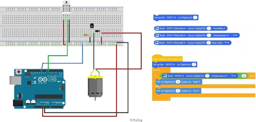 In Figure 14 we see the final real implementation of the project, thoroughly explained in [25]. Programming the hardware is done precisely through mBlock, already widely used by children. The Arduino UNO device is simply added to the software, and by connecting the Arduino to the PC, the program written through the blocks is loaded to it.