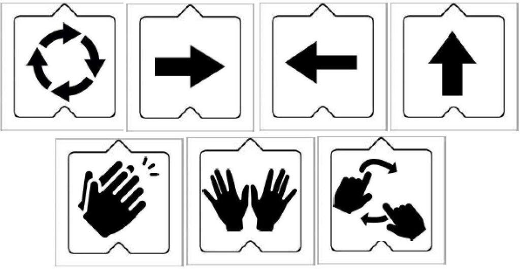 The second proposed game, on the other hand, combines coding and movement: each tile represents a movement to do, as shown in the Figure 2. Education tiles with the movements on them are made available to the children. They take turns choosing their favorite movement and, putting them in sequence, create a dance to try all together. This type of exercise can also be proposed during motor skills hours by changing the symbols as desired to create motor pathways for the children.