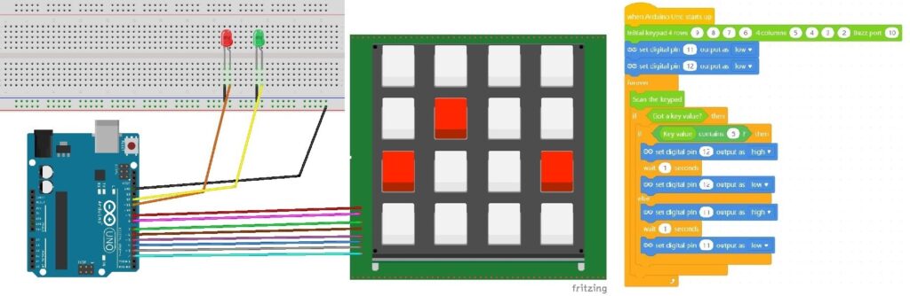 In fact, of course with great help from the teacher, it was necessary to include other elements: a resistor, a diode and a transistor. In Figure 19 on the left we see the design and on the right the block programming. The second is a pad with security code for school entry. For ease of resolution, the code is a single digit. If the correct digit is pressed, the green LED lights up, otherwise the red one.