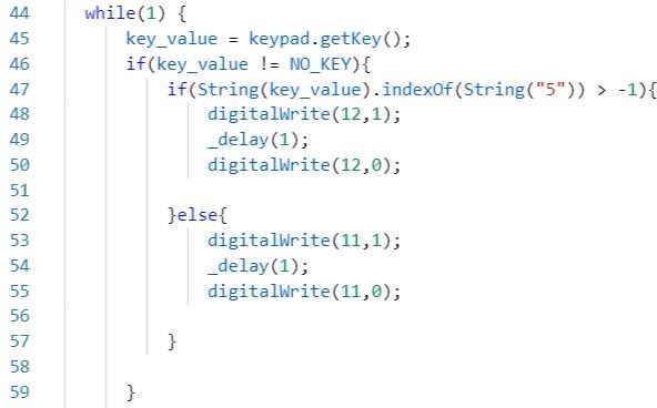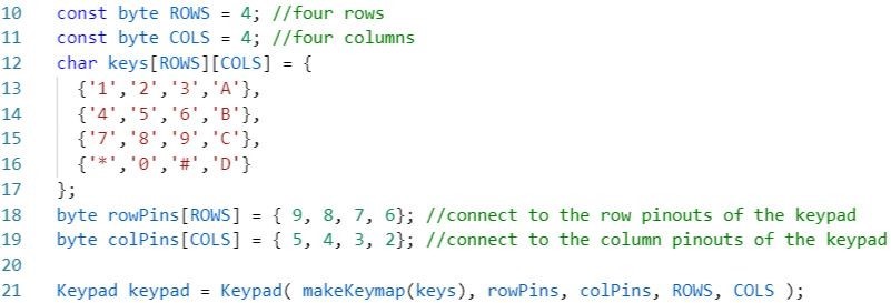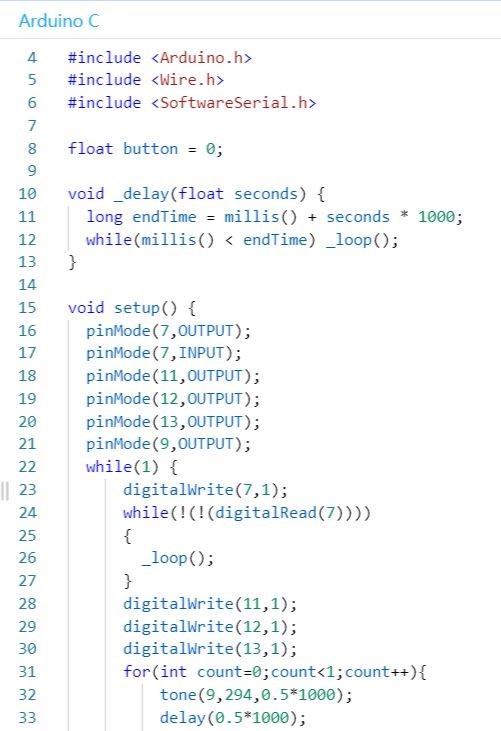 The final step will be to show the programming code related to the blocks they used on mBlock and try to analyze it together, so as to have a first approach to the actual programming. The code in C language related to the hymn implementation blocks, being very simple and repetitive, lends itself well to being a first approach in which the struc- ture of a program written in code is studied. As can be seen from the extract of Figure 23, the following can be highlighted: the inclusions of external libraries in the head of the file, the subdivision into functions, the initial setting of the variables, the main while and for loops,several calls to functions which will give an output relative to the variables that are passed as input. A more advanced analysis can instead be carried out thanks to the code relating to the exercise on the security access code. In Figure 24 students could, first of all, understand how the Pad matrix and its configuration on the hardware side are instantiated, so as to be able to uniquely encode each key pressed. The final challenge that can be proposed is to analyze the code to find the right point, shown in Figure 25, which must be changed to change the security code that should be pressed on the Pad.