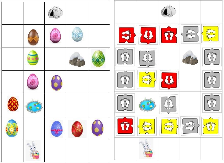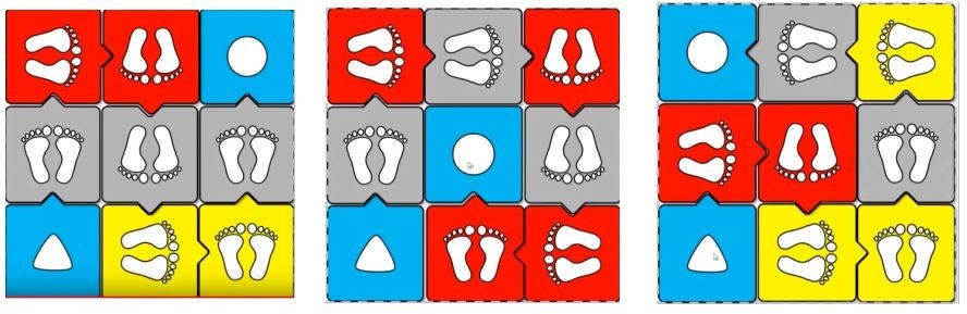 The first challenge to propose is to try to get the children to create an increasingly shorter path, until they achieve the shortest possible one. This explains the importance in achieving a goal with as few instructions as possible: it is achieved in less time and the performer gets less tired. The link to scheduling in the business world is becoming more and more evident, but there are still generalizable motivations: for example, planning better for a long journey allows one to arrive at the destination sooner, less tired and spending less money on fuel. Some planning concepts can then be explained through simple games, such as creating a tree of depth 5 by keeping the same starting point but, by choosing tiles from a predefined set, reaching different end points. By drawing each path on an A4 sheet of paper with the 5×5 checkerboard reproduced and going over it on tissue paper, the various paths found, when overlaid, will show just such a tree. Again, is sent a document to their parents, with an explanation of what was done, together with tiles and chessboards that they can print out to play with their children on A4 sheets. Some challenges proposed for home, and shown in Figure 3,are a first approach to the concept of constraint, which will later be explained at school. Using a 3×3 chessboard, how could it be filled using any tiles? How could it be filled if one had no yellow tiles? What if one had only two grays?