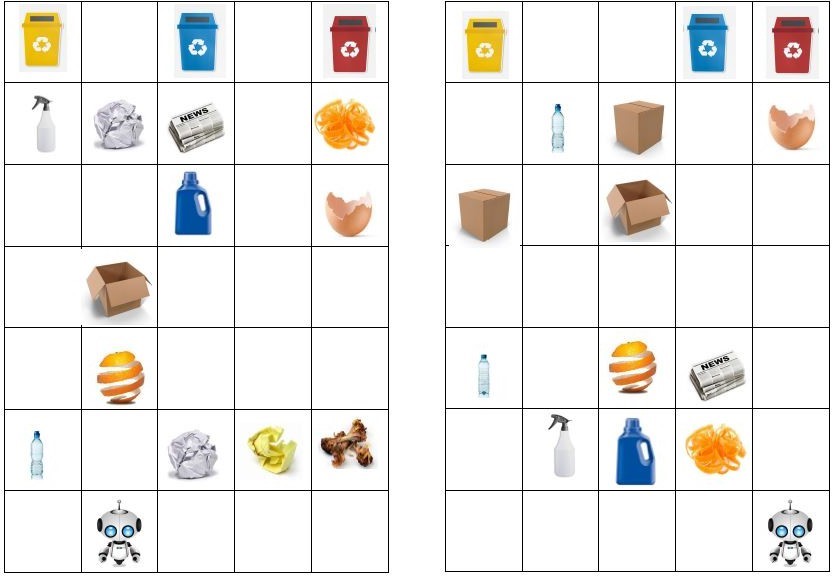 The concept of constraint in class is introduced with a google maps satellite map where they can see their school from above. Different groups of children are asked to draw the route they would take to reach a house nearby where they are having a big party. They may choose different routes, but instinctively they will follow the constraint of only being able to drive a car on one road: none of them go through a farmer’s field or a park, even though doing so might take a shorter route! During exercises on the chessboard, constraints will be obstacles of various kinds to be avoided in order to reach the goal. Again, they develop concepts through themes they are dealing with in school or by linking them to a particular time of year. In this three-year project, for example, a game was proposed where the child had to program a robot to make it clean a room of garbage by managing a separate collection of items: paper, plastic and organic. As shown in the Figure 4 in order to clean up everything it will be necessary to start with one type of objects and then move on to the others.