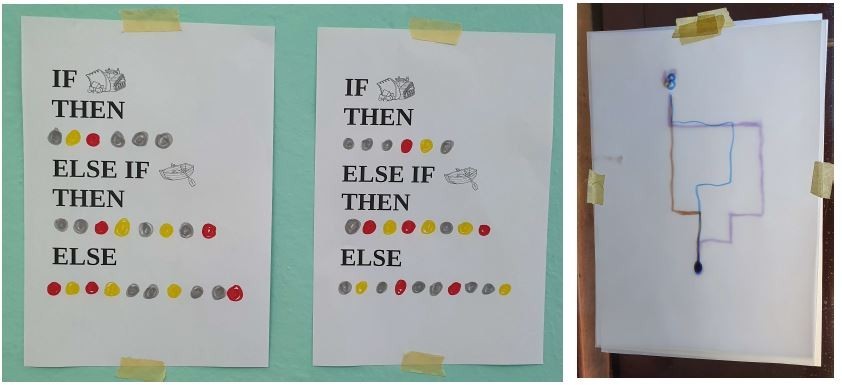 During the third year of the piloting of this program, the 2021/2022 school year, one section of the school was following a parallel experiment in which the section teacher, from the morning reception until the end of lunch, communicated with children only in english language. We then took advantage of this for a joint, more in-depth lesson on exercises related to one of the cycles of programming. The english teacher previously explained the key words IF THEN ELSE to the children. Next, taking a cue from the story of a bee that served as a thread for the various exercises on the board, children are divided into 3 groups. In the first group the bee, which cannot fly because it has injured a wing, will have to reach the hive while avoiding lakes and stones. In the second group the bee will be given a bulldozer and will be able to go over the boxes with stones. In the third group the bee with the boat will be able to cross the lakes. At the end of each of the three paths, the tiles used on the small checkerboards on the A4s are redrawn and overlaid on tissue paper. This time overlaying the 3 tissue papers will show the decision tree. The first real pseudocode is then made for the children to write. An A4 has already written IF <drawing bulldozer> then <free space> ELSE IF <drawing boat> THEN <free space> ELSE <free space>. In the three free spaces, the children will draw the sequence of colors they used in the three paths. This simple pseudocode got them so excited thinking they were becoming real programmers that they wanted to do it again, with the results shown in the Figure 6.