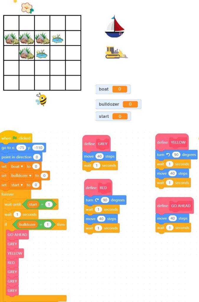 Harking back to the previous lesson, we begin by showing, on old smartphones lent by parents and given to various groups of children, a game in which, using exactly the pseu- docode written with them in lesson three, the bee makes the three different paths. The mblock platform was used for this purpose, as it easily allows one to create ad-hoc blocks and visually reproduce exactly the sequence that the children see on the sheets they filled in. In figure 7 we can see on the upper part the game and on the lower the code, with the color of the instructions that the children had chosen in the different paths.