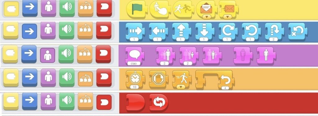 Scratchjr is a declination dedicated to younger children and can therefore be approached in first grade. In this case blocks do not have written description of the related instruction but explain it with an intuitive picture. Available blocks are divided into 6 groups according to their functions: