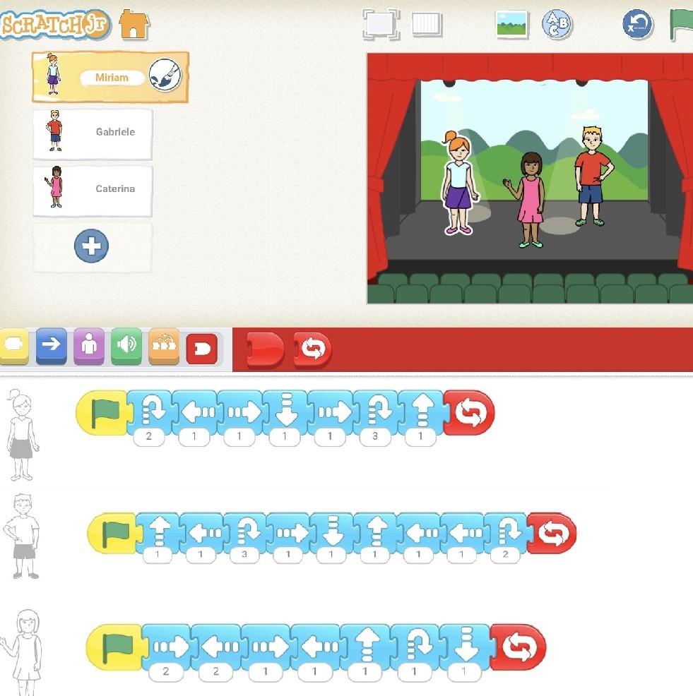 One of the main tools of coding is visual or block programming: this type of programming offers an intuitive approach, reducing syntactic rules to simple interlocking between blocks of complementary shape. In short: the program code does not have to be typed. Even for children as young as 5 or 6, who still need to learn to read and write, visual programming thus allows them to immediately ex- perience the effect produced by the colored blocks on the characters, called sprites, that animate the story or game being created. As children play and invent stories, they have to work hard to figure out which colored blocks to choose and fit together to recreate what they have in mind. As they do this, they unknowingly write lines of computer code. Block programming is shown as a first approach to technology.