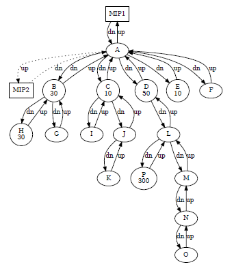 operator band parameter represents the cumulative amount of band reserved by any operator on that node. Dotted edges represents inactive links. This kind of edges usually connects a node A to one of the MIP nodes available. As depicted in Figure 1) node A is configured using an active-standby pattern, where the connection to MIP2 is the standby or back-up part which is exploited if and only if MIP1 link fails.