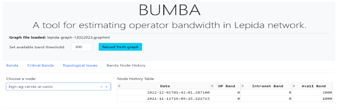 In addiiton to the “Banda” tab, this version has been enriched by three other tabs which respectively correspond to the graph sanity check features. The new tabs are named as follows: “Critical Banda”, “Topological Issues” and “Banda Node History”. In the following, we are going to focus on their respective interfaces.