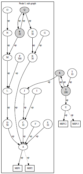 An simplified example of the particular structures (graphs) we have to deal with is provided in Figure 1, where a sub-graph for a target node L is shown. Suppose that an operator requests to allocate a band amount x over node L. From the whole graph, we have to extract or isolate the sub-graph in which node L is located including its neighbors and their (eventual) sub-trees in a recursive More precisely, staring from node L, we add nodes until: (a) a leaf node is found or (b) an END POINT node is found. We remind the reader that the ENDPoints set is given by the union of MIP and DC node sets (see Table 1). In order to simplify the plot even further, all links speed is set 1 Gbit/s and it is not shown explicitly.