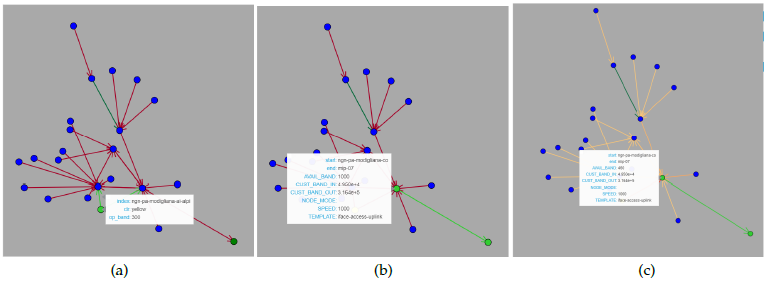 - Operator band calculation and visualization: the sub-plot in Figure 6(c) shows the target node sub-graph after the residual band calculation. As sub-plot (b), this visualization is edge By inspecting the edge (i.e.: linking: ’ngn-pa-modigliana-co’ → ’mip-07’) we can see the AvailBand field annotated with the actual residual bandwidth. From the GUI it is possible to follow any path and inspecting the bandwidth at each hop. In addition, the output cell of the notebook shows bandwidth information along the path between the target node and its END POINT:
