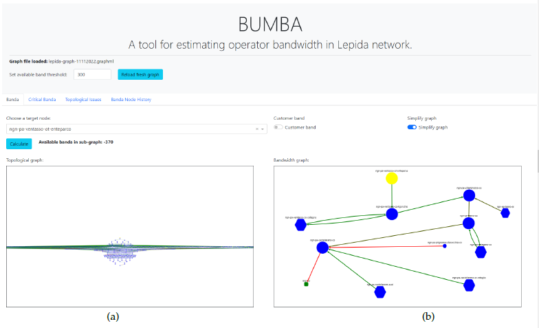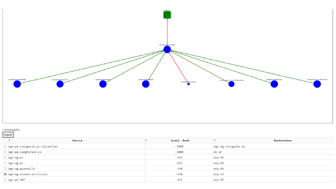 The “Critical Banda” tab interface is shown in Figure 8. The graph plot shows the topology of a sub-graph which is the one in which lies the selected edge picked from the bottom table. The plot edges color shows their status. In fact, the selected edge is represented in red color as well as “ngn-pa-ozzano-ai-iaco” → “mip-13” edge.