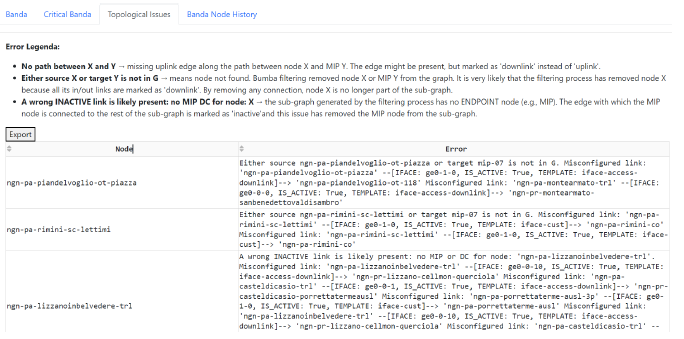 The next tab is dedicated to topological issues and it is shown in Figure 9. Here, a table collects any exception error triggered by search algorithm over the graph (i.e., G_errors data structure). For each target node triggering an exception we have a table record with a corresponding “Node” column. The “Error” column contains all the required information (such as: node names, device interfaces, template description, . . . ) in a human readable form in order to fix the corresponding issue on the NMS. As in the previous tab, the table data can be downloaded for offline processing through the “Export” button.