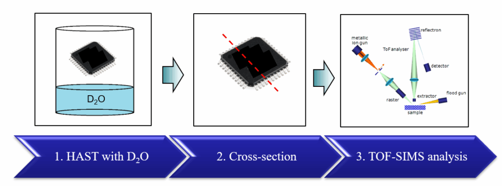 1) Sample treated with D2O: The samples were loaded into the HAST chamber with condition of 85°C/85%RH for 1 hour. In the HAST run, H2O was fully replaced by D2O in the chamber. The purpose is to let D2O moisture permeate into the package through the invasion paths.
