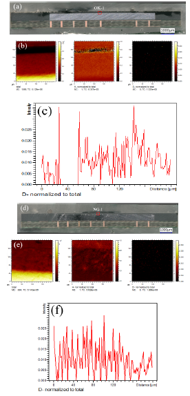 As discussed in previous section, another possible moisture penetration path is through the substrate to the die where there is no Cu layer to block the moisture penetration (Path 3). Figure 7. shows the ToF-SIMS surface scanning on the path 3 areas of both OK and NG samples. Figure 7a-7c shows the OK sample ToF-SIMS scanning area and D data, and Figure 7d-7f shows the NG sample data, respectively. Figure 7c and 7f show the D ion intensity profile from substrate bottom to the top. By comparison Figure 7c and 7f, weak D signal was detected at Path 3 areas for both samples, but there was no obvious different between these 2 samples. So, it is suggested that moisture penetration through Path 3 was weak and was not contributed to the sample failure.