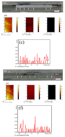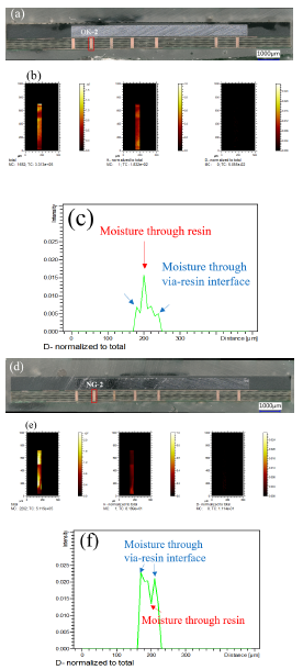 Same analysis was performed on the bad sample (see Figure 5d-5f). Figure 5d shows the ToF-SIMS surface scanning area of the via in the bad samples, called area NG-2. The D ion mapping is showed in Figure 5e. Figure 5f presents the D intensity profile from left to the right side of the via. In Figure 5c, it is showed that there are 2 strong sharp peaks at the via-resin interface. However, the D intensity of the resin center is much lower. It indicates that in the bad sample, moisture penetration was mainly by the via-resin interface.