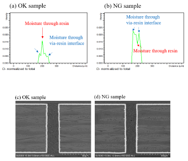 For easy comparison of the OK and NG sample, Figure 6 compared the D signal in the via between these 2 samples. It is obvious that moisture penetration ways are totally different between these 2 samples. In the OK sample, moisture penetrated mainly by the resin (see Figure 6a). Whilst, in the NG sample, moisture penetrated mainly by the via-resin interface (see Figure 6b). It is also noted that D intensity of the NG samples is much stronger than that of the OK sample, indicating more moisture penetration. The next question is why the moisture penetration path and intensity of the OK and NG samples are different? It is suggested that the interfacial adhesion of via-resin of the NG sample is weak which allows easy moisture penetration. SEM characterization was performed to characterize the OK an NG vias (see Figure 6c and 6d). However, there is no obvious gap or delamination of the via-resin interface of the NG sample, neither the OK sample. It is suggested that because the molecular diameter of water molecules (H2O) is about 2.75 angstrom, which is much smaller than that of the resolution of SEM.