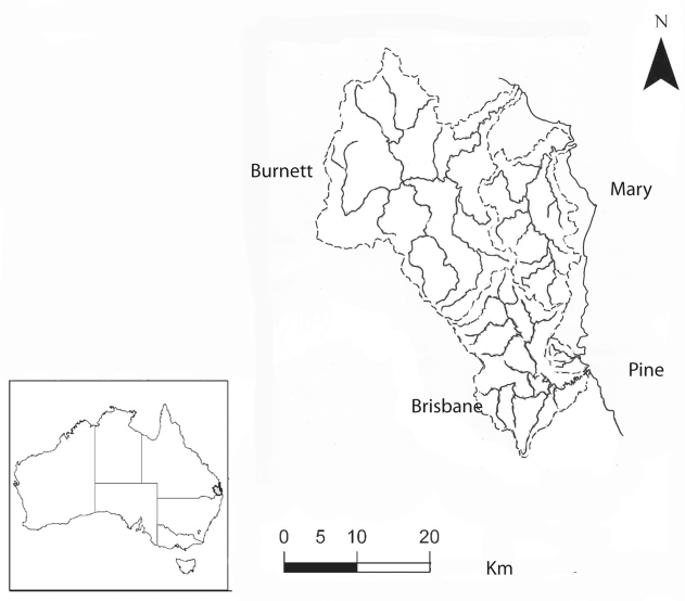 The Pine River system, with two branches, imaginatively labelled South and North, is a coastal river system (Fig. 1), originally similar to the Brisbane River nearby in flora and fauna. The South Pine River is a creek, quite small. Both rivers rise in the foothills of the D’Aguillar ranges, well separated from the Brisbane River catchment, and flow east into the sea at Bramble Bay.