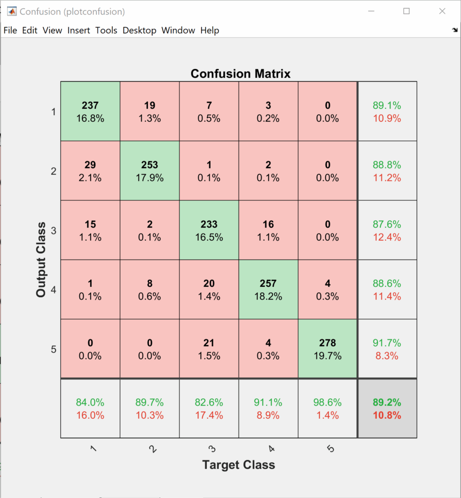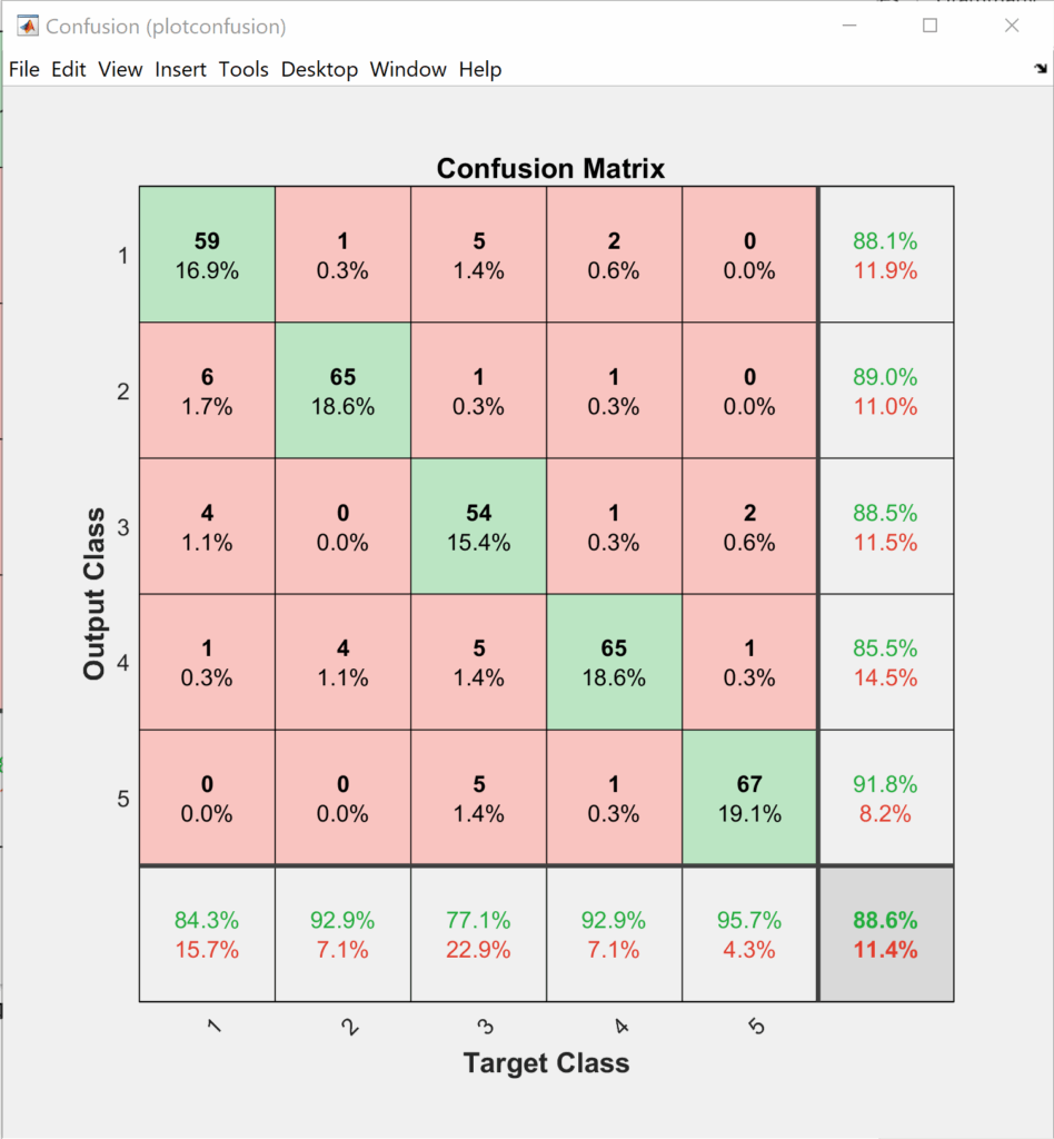 The order of the classes at the output layer of the classifier is as follows +5°, +10°, -5°, -10°, and 0°. If we look closer into Figure 4 and Figure 5 we can notice that most of the confusion happens between the same direction motions. So, if we do a simple probability analysis on the testing data, we can see that adding the two longer displacement classes helps in keeping the error within 5°.