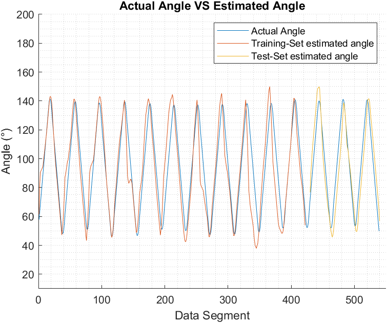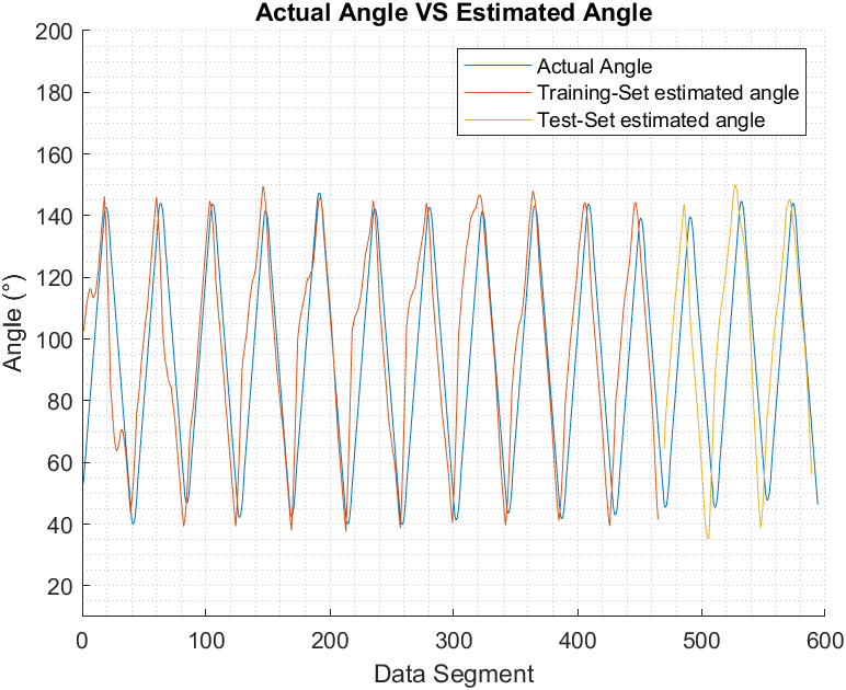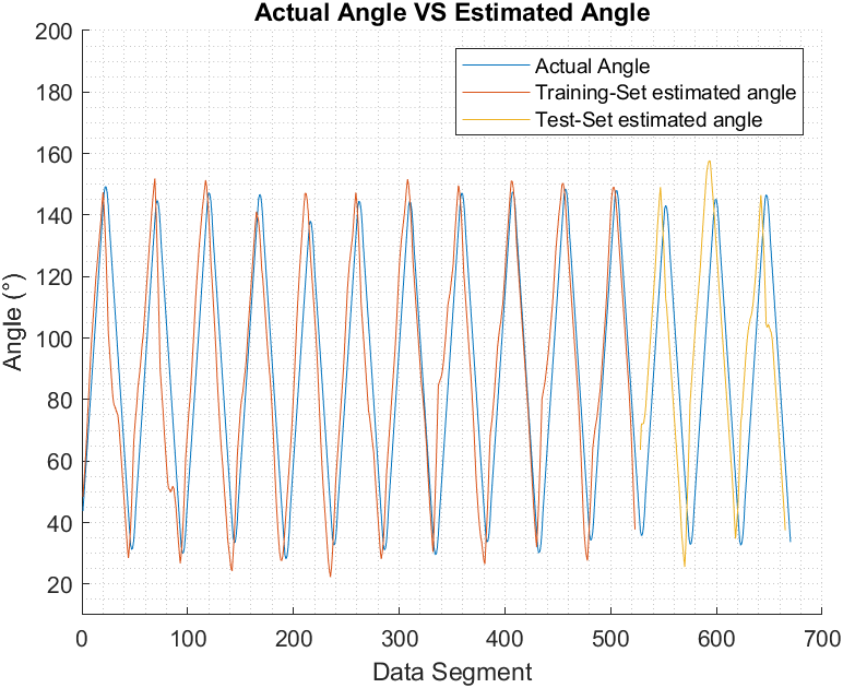 The developed estimator can predict the current data segment joint angle with high accuracy regardless of the previous and the next data segment angle estimation accuracy. In other words, misestimation in a single data segment doesn’t affect the consecutive data segments. Moreover, due to the selected movement classes, any misestimation will stay within the set 5° resolution which is reflected by the high PCC values shown in Table 1. The choice of features across time-domain and frequency-domain, the choice of classes, and the choice of the classifier all contributed to high estimation accuracy with 0.91 to 0.95 correlation between actual and estimated elbow angle by using only four sEMG sensors on the joint’s agonistic and antagonistic muscles.