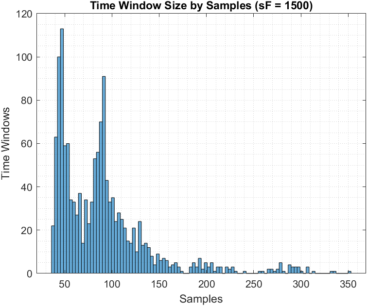 Figure 9 shows the histogram of time-window length in seconds for weighted biceps curls (i.e., 5 lbs) which in turn shows that the estimator was able to work with a variety of time-window sizes for the same angular displacement (and thus variable speeds) and still maintain high accuracy, i.e. +80% in classification and 0.91 in correlation.