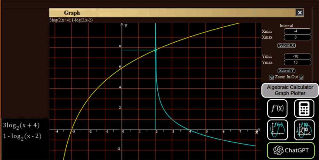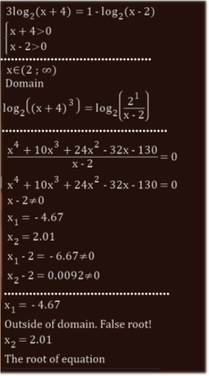 $$3\log_{2}(x + 4) = 1 – \log_{2}(x – 2)$$