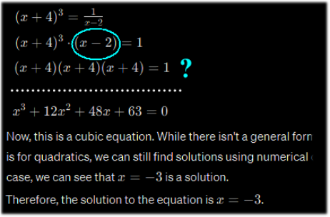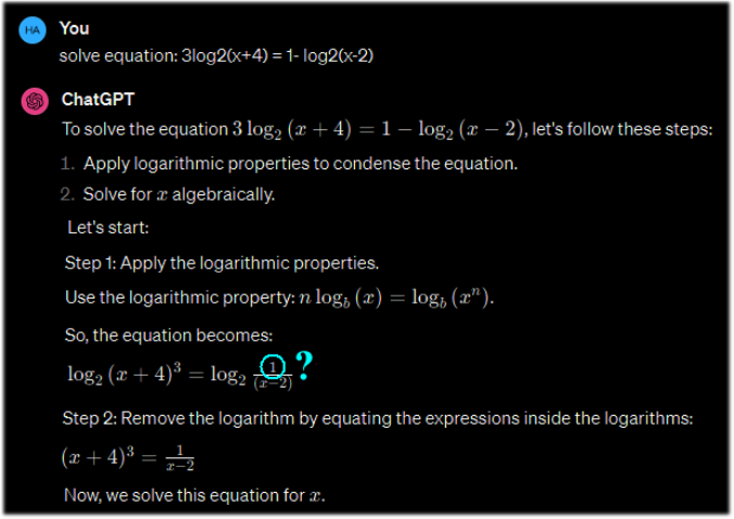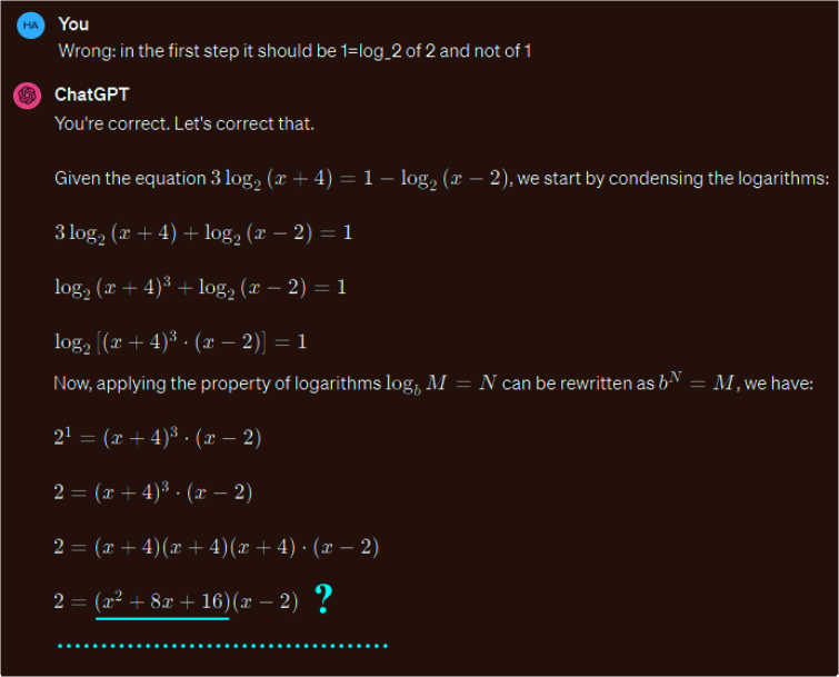 ChatGPT 3.5 gives a correct answer to the first question, including detailed explanations (Figure 9), but fails to solve the equation, giving the (correct!) comments for the incorrect calculations (Figure 10 and Figure 11), and final wrong answer (Figure 11).
