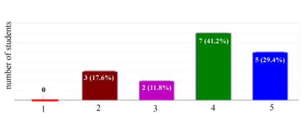 Figures 16 and 17 display the responses of students to the following queries: To what extent did the system help you in preparing to class exam? (Figure 16) and To what extent was the operation of the system simple and clear? (Figure 17) (on both diagrams the horizontal axes show the rates of correspondent values).