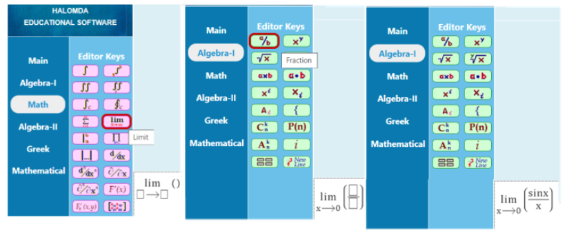 In addition to incorporating an AI bot into the system interface, Halomda developed a tool to graphically edit mathematical expressions and present them in the LaTeX format required by ChatGPT. For instance, to compose a prompt for ChatGPT including calculation of the limit: \(\lim_{x \to 0} \frac{\sin x}{x}\), it is required to type: